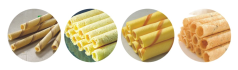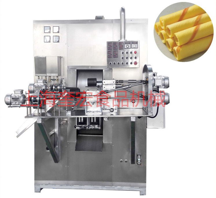 面料打浆机可轻松搅拌面浆,具有面浆均匀、搅拌时间短的优点,再经过送浆机传送至主机烘焙。烘焙工艺采用气体加热,炉灶点火装置为电磁阀自动引火,灵敏度高,操作简便。烘焙轮毂可调节轮转速度,并由自控温度探测仪进行温度控制,轮毂温度过高或过低时可自动调节,保持恒温状态,能有效避免能源气体浪费。灌芯芯棒及卷成型装置使用变频控制器电机,可调整速度。芯料经球磨打料,经灌芯机自动注入面皮,通过卷成型绕城棒状,送至自动切刀装置切棒。蛋卷厚度直径,可通过芯棒轴上下调节改变。